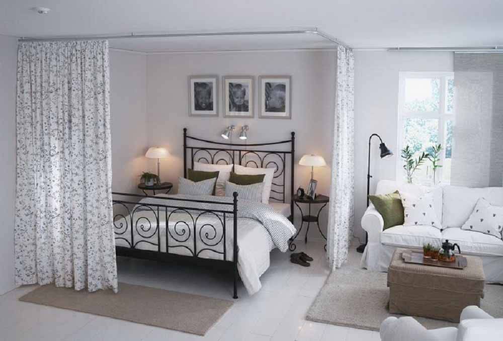 Традиционно, шторы используют для зонирования спального места. Этот вариант зонирования популярен в квартирах-студиях. Шторами можно занавесить как кровать, которая располагается в нише, так и отдельно стоящий предмет мебели. Когда к вам будут приходить гости, кровать можно будет зашторить, тем самым, скрывая ее от посторонних глаз. В любое другое время спальное место может быть открытым.