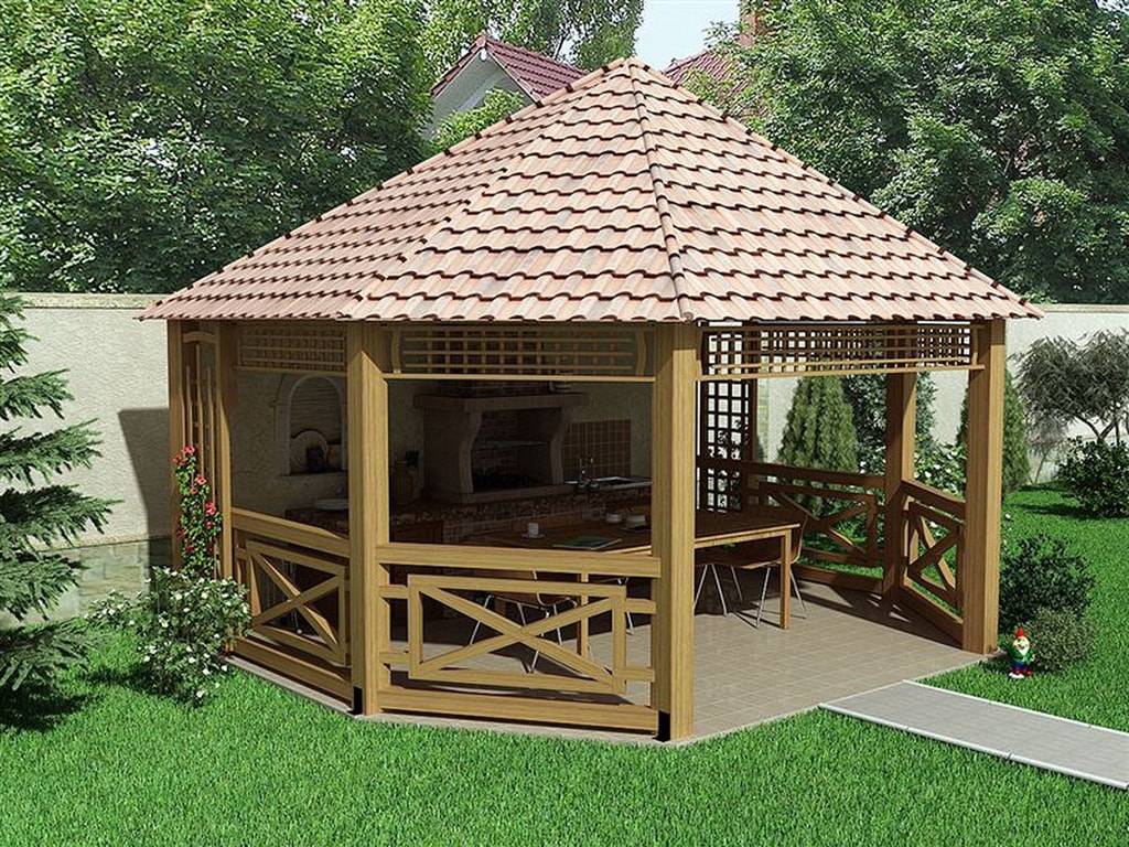 Современные строители и изготовители навесов для отдыха предлагают самые разные сооружения – круглые, квадратные, в форме шатра и пр. Выбирая многоугольники с большим количеством граней, тщательно просчитывают место для установки, тут нужна большая площадь.
