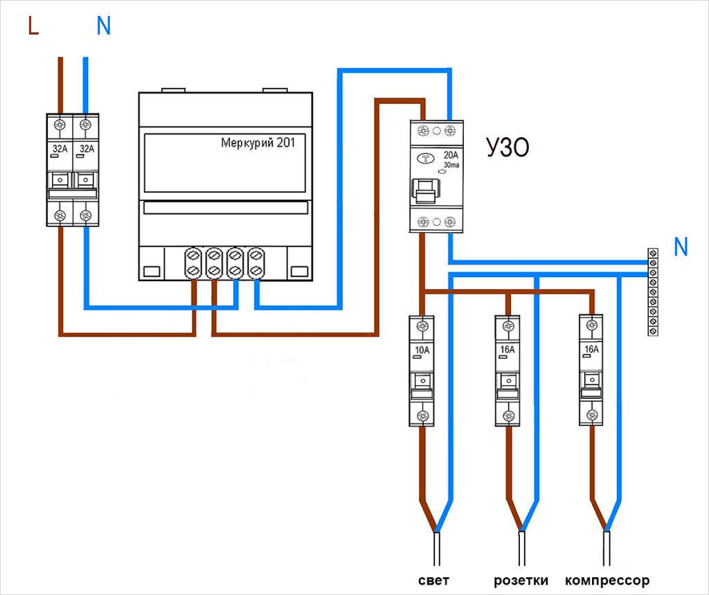 Обратите внимание: вместе с электросчетчиком производится установка модульных элементов, УЗО, входного автомата. В электрощитках обязательно монтируют специальные шины для распределения заземления (PE) и нуля N
