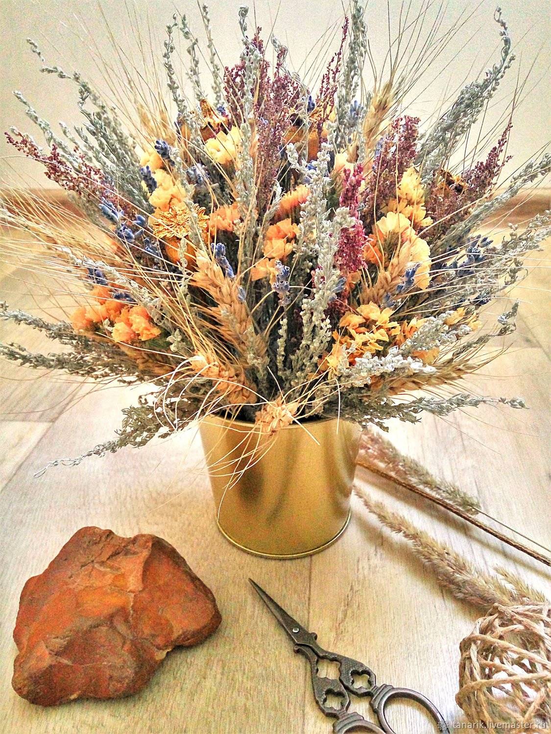 Для создания композиции из сухоцветов потребуется низкий и широкий горшок. Емкость не обязательно должна иметь на дне отверстия, она выполняет исключительно декоративную функцию. Чтобы растения простояли дольше и не обсыпались, на дно вазы укладывают флористическую губку. С помощью ножниц придаем пенофлору необходимую форму и вставляем в него стебли растений. Оформление композиции должно проходить по следующим правилам: