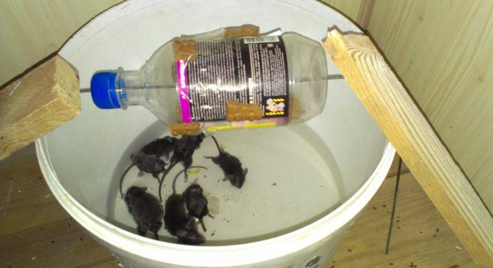 В крыше и донышке делается отверстие. В него вставляется любой подходящий прут. Получается ось вращения. Несложную конструкцию ставят над ведром, к которому подставляют дощечку, либо другой подходящий предмет. Это будет подход для мыши. Принцип работы заключается в следующем: грызун поднимется к бутылке, предварительно обработанной привлекательным для вредителя продуктом. Когда мышь забегает на бутылку, простая конструкция переворачивается. Животное сваливается в ведро, выбраться их которого самостоятельно не получится.