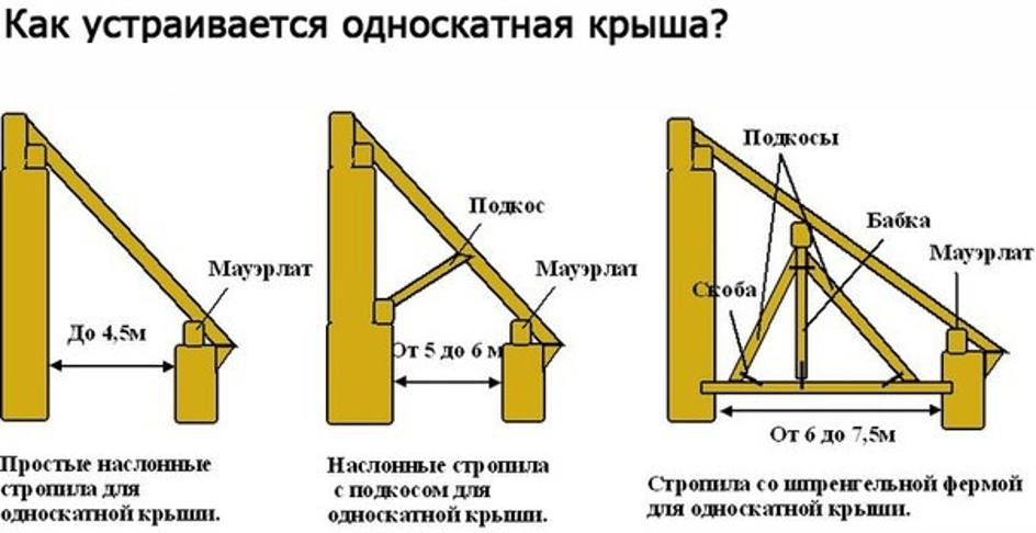Пролеты свыше 6 м принято опирать на три точки – две несущие стены и шпренгельную ферму, например, или с опорой на лежень. Пролеты 4,5 м применимы в мансардах, террасах, банях, верандах, а также различных пристройках. В жилых постройках, как правило, расстояние между опорами равно или превышает 6 м.
