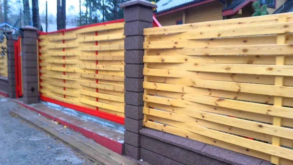 Забор из досок своими руками подходит не только для украшения участка, но и для заграждения его с внешней стороны улицы. Обычно он изготавливается из соснового пиломатериала толщиной 2-2,5 см. Столбы для ограждения можно сделать из бруса минимальной толщиной 10 см, или профильной трубы. Они устанавливаются по разметке с шагом 2,5 метра с обязательным условием – бетонирование основания. Забор с плетеными досками тяжелый, поэтому бетонное основание необходимо для его устойчивости. Доски чередуются друг с другом по горизонтали или вертикали, огибая столбы с внешней и задней стороны. Крепление осуществляется на саморезы. Столбы и доски обязательно нужно покрыть специальными защитными средствами: антикоррозийными спреями или краской по металлу, а также пропитками для дерева, защищающими от грибка, гниения и прочих вредных воздействий. Чтобы придать древесине цветной оттенок, можно покрыть забор морилкой, или фасадной краской. Краску нужно будет обновлять один раз в два года.