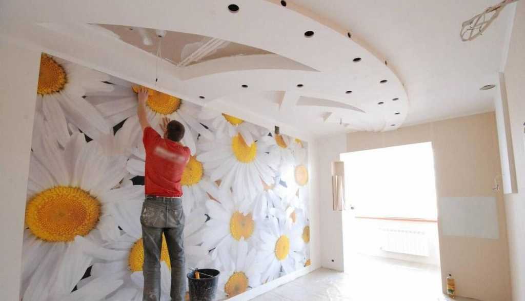 Многие клеят комнату обойными полотнами только после установки потолочной конструкции. Это обусловлено следующими факторами: