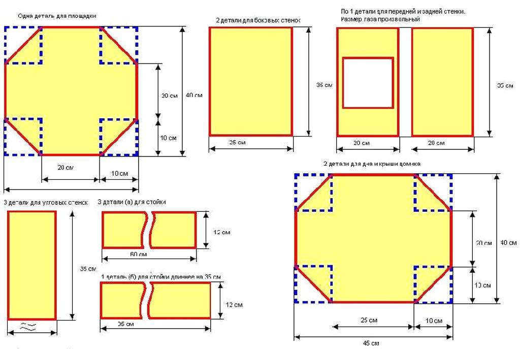 Выкройка домика делается из картонной коробки 45×45 сантиметров, из другого картона получают четыре равнобедренных треугольников с основанием в 45 сантиметров. При желании, если под рукой нет картона, можно использовать газетную бумагу. Выкройка домика включает детали наружного и внутреннего чехла припуском на швы. На одном из треугольников нужно вырезать ближе к основанию круглое отверстие размером 20 см в диаметре. Если картон большой выкройка домика может быть сделана при помощи изгибов на этом картоне.