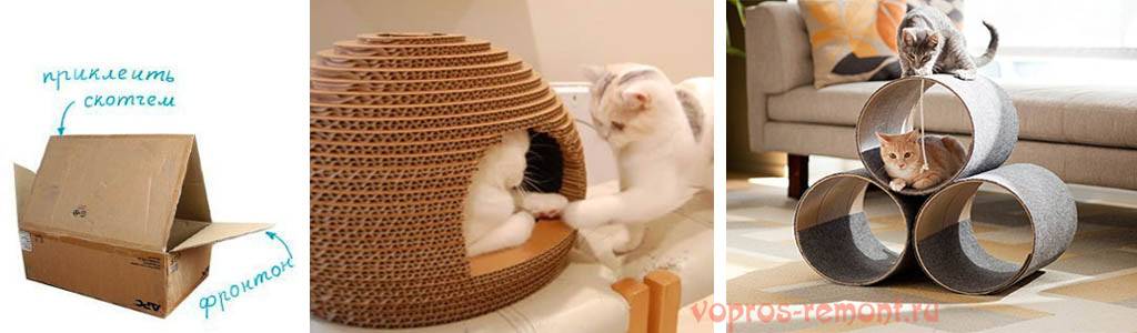 Следующий вариант применения картона – лежаки для подросших котят. Отделяться им еще рано, но свой уголок каждому уже нужен. Здесь хорошо выручат картонные шпули или тубы из-под листовых материалов. Из них можно буквально за час соорудить целый городок для кошачьей мелочи, справа на рис.