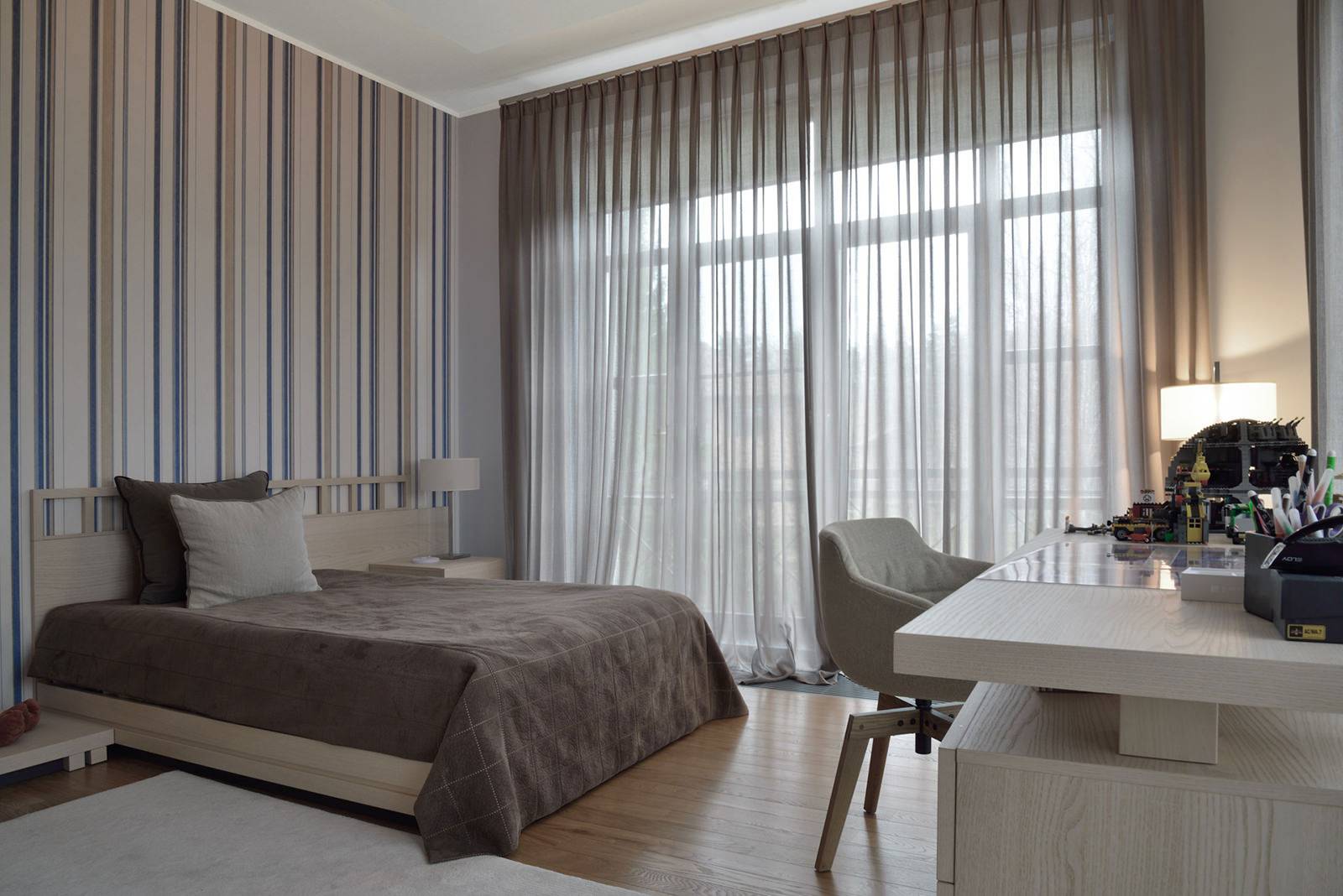 Использование близких по оттенку штор к цвету комнаты визуально позволяет нам ощутить комнату как единое пространство, что расширяет помещение и не скрадывает высоту потолка даже в маленькой низкой комнате.