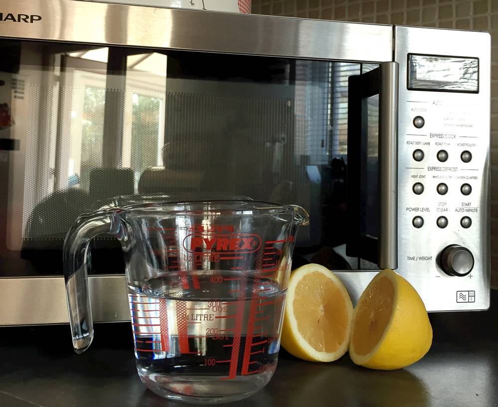 При чистке лимоном или лимонной кислотой работает тот же принцип «бани». Только вместо простой воды используется раствор, приготовленный из 200-250 мл воды и сока 2-х лимонов или 1 чайной ложки лимонной кислоты. Цедру лимонов можно также положить в жидкость, тогда бонусом получится приятный цитрусовый аромат. Вместо лимона можно использовать лайм или даже апельсин.