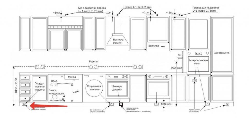 Оптимальная схема расположения розеток на кухне с учетом подключения ПММ и стиральной машины