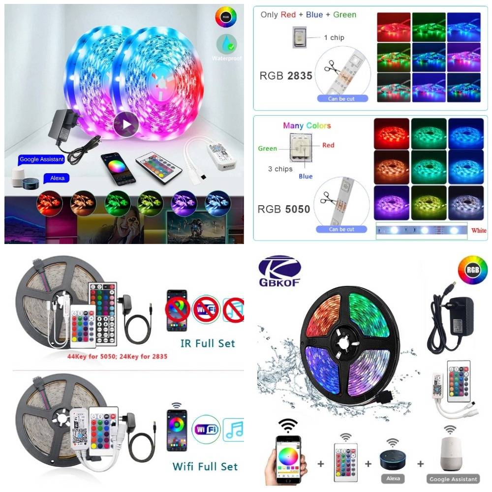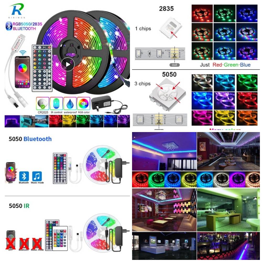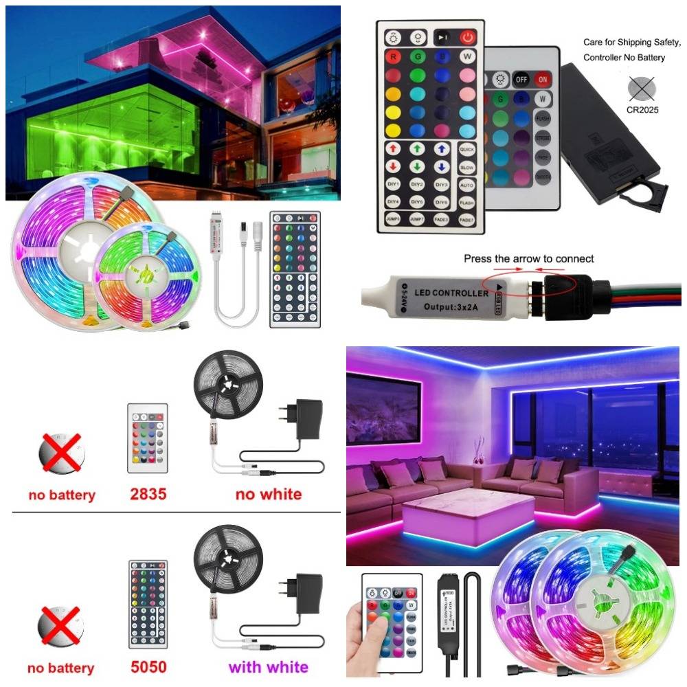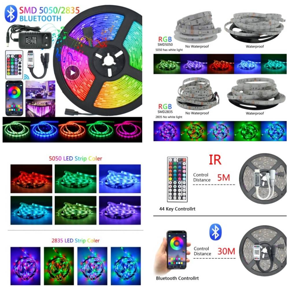Производитель предлагает массу разновидностей ленты: модели с длиной 5 или 10 метров, с наличием или отсутствием влагозащиты, а также с разными диодами – 2835 и 5050. Комплект поставки включает в себя инфракрасный пульт на 24 или 44 кнопки, а также адаптер постоянного тока на 12В. К слову, пульты поставляются без аккумулятора или батареек.