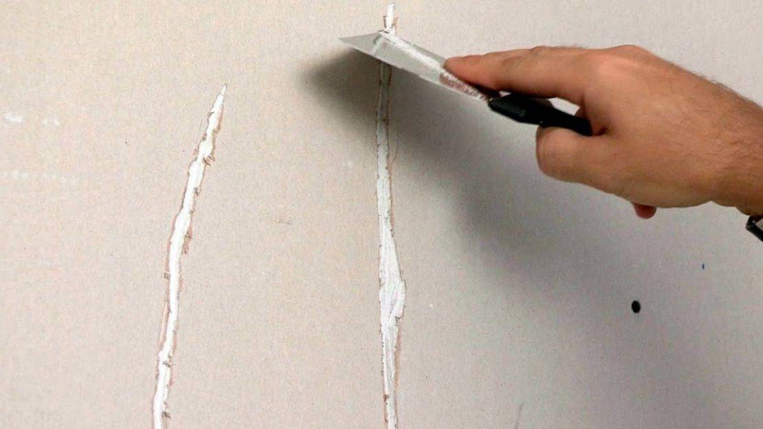 Начало всех ремонтных работ начинают с расшивки трещины. С помощью шпателя или ножа увеличивают трещину в ширину до 5-10 см. Слой шпаклевки в этом месте удаляется на всю глубину, до самой поверхности гипсокартона. Главная задача – это убрать все осыпающиеся частички отделки.