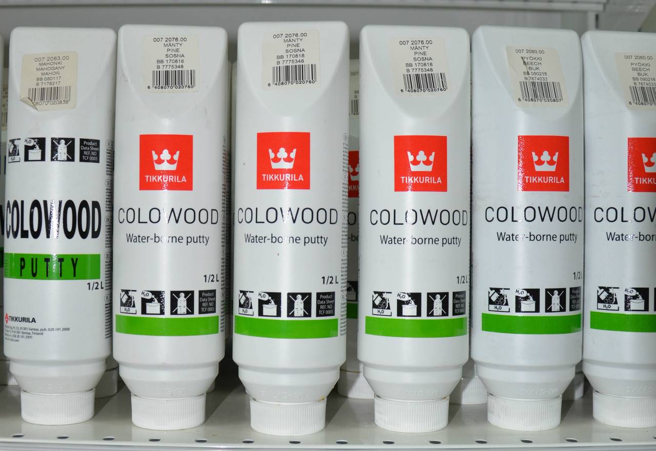 Тиккурила выпускает средство, разводимое с помощью воды. Слой может достигать 2 миллиметров, после просушки не происходит покрытие трещинками. Завершение застывания приводит к получению того же оттенка, что и древесина. Это позволяет избежать дальнейшей покраски. Производитель предлагает на выбор различные оттенки шпаклёвочных растворов, которые повторяют цвета пород деревьев: