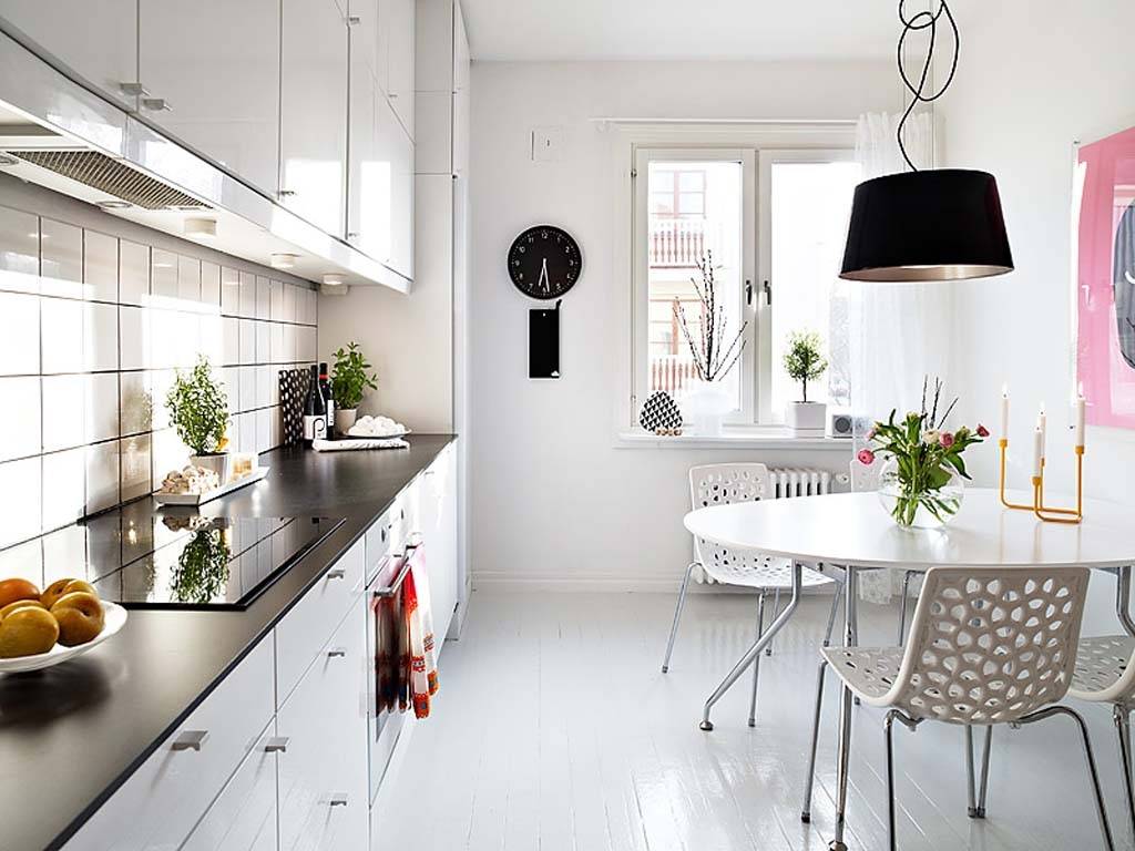 Белые обои универсальны, они подходят под любой стиль, делают больше маленькую кухню. К тому же, белый не такой маркий, как может показаться: темные оттенки в этом плане даже менее практичны. Белая кухня выглядит свежо, побуждает к творческому проявлению в декоре.