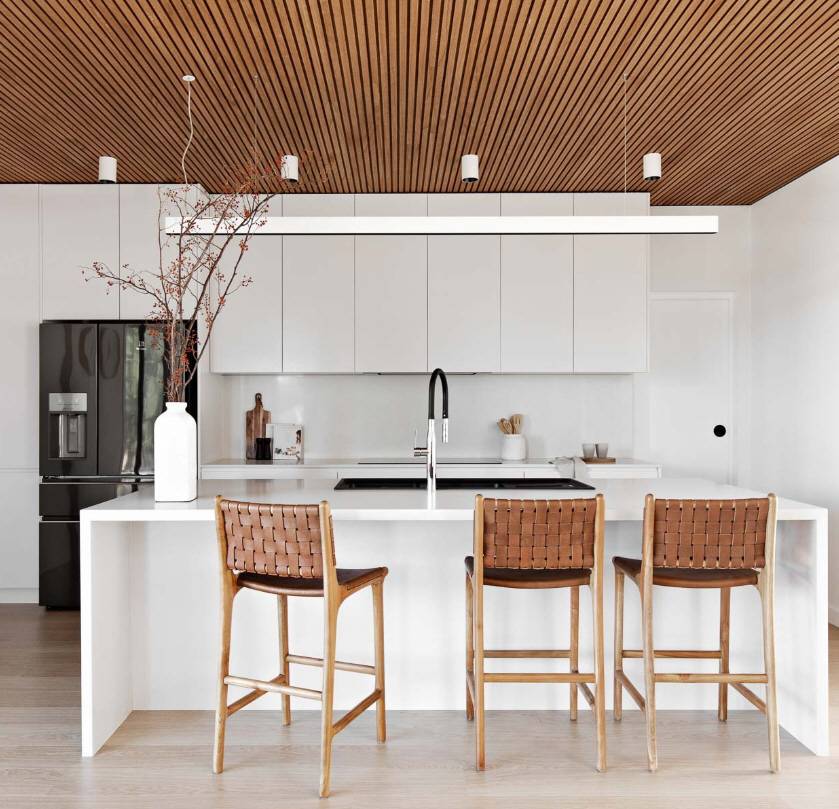 Подобные варианты отделки потолка на кухне отличаются эстетикой содержания и прекрасно справляются со своими основными функциями. В зависимости от типа жилого строения, могут быть использованы рейки длиной 3 или 4 метра. Ширина деревянных элементов варьируется в пределах 9-20 см, что очень удобно в плане выбора. Обычно в работу идут стандартные рейки длиной 4 метра и шириной 10 см.