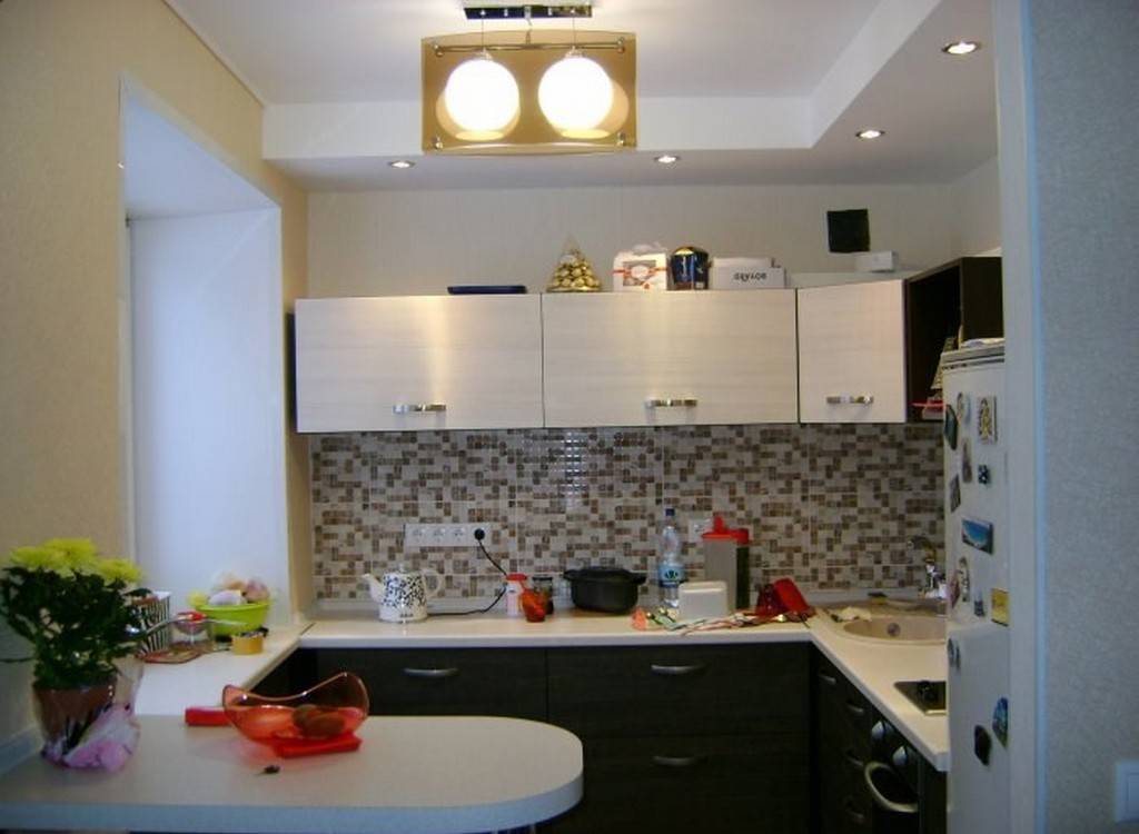 А вот проекты попроще вполне жизнеспособны даже в формате скромных кухонь из видавших виды хрущевок. Чаще всего можно наблюдать вариант с зонированием пространства на 2 функциональные части: обеденную и рабочую. Нижний уровень, как правило, используется для организации акцентной подсветки над второй из указанных зон.