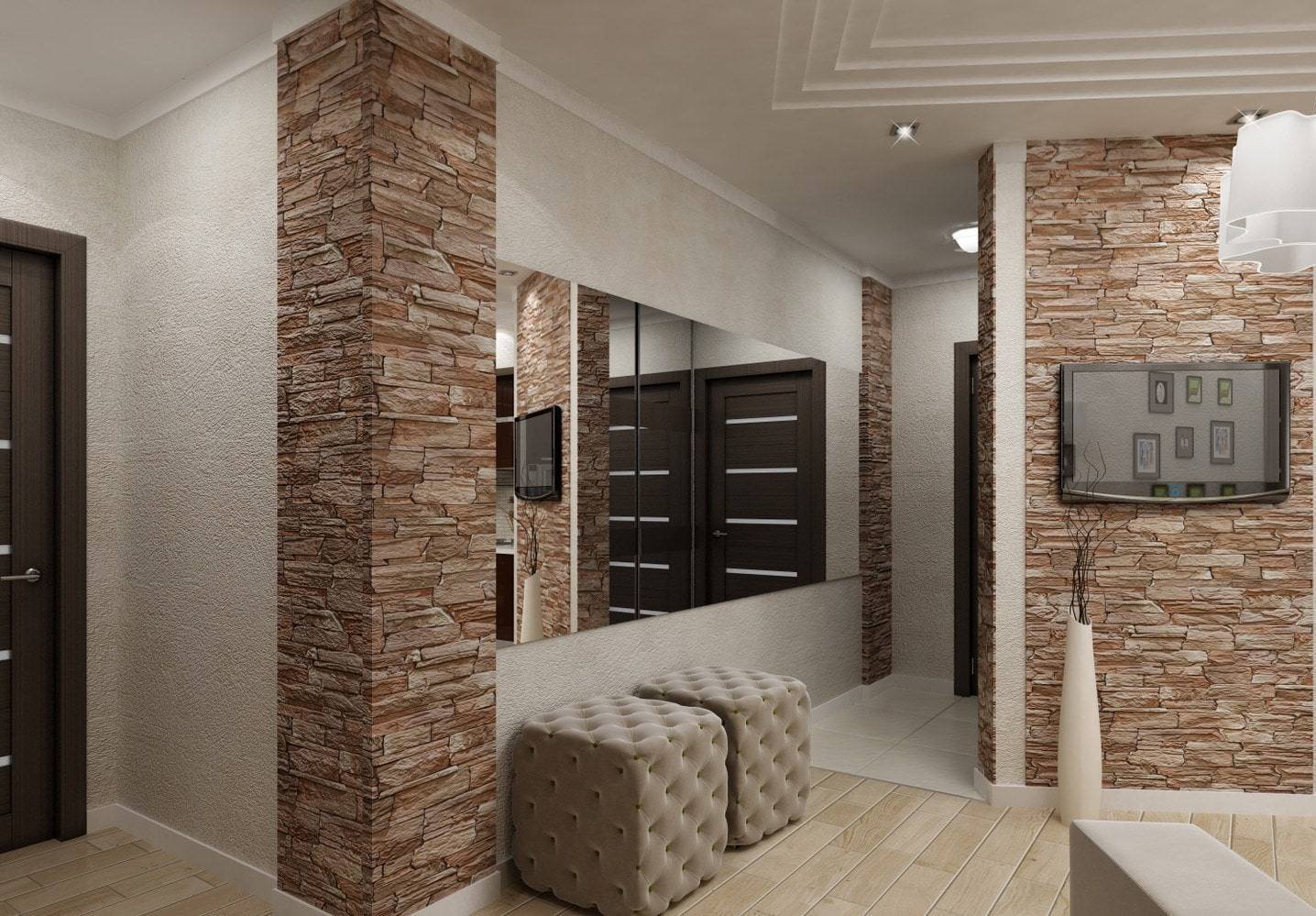Под данные характеристики отлично подходит отделка прихожей жидкими обоями и декоративным камнем. Но можно применять и другие виды обоев.