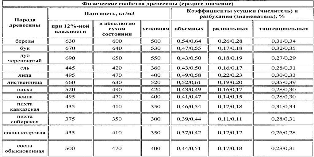 Давайте для начала посмотрим в таблицу, где показана не только плотность разных пород древесины, но и коэффициенты их усушки и разбухания.