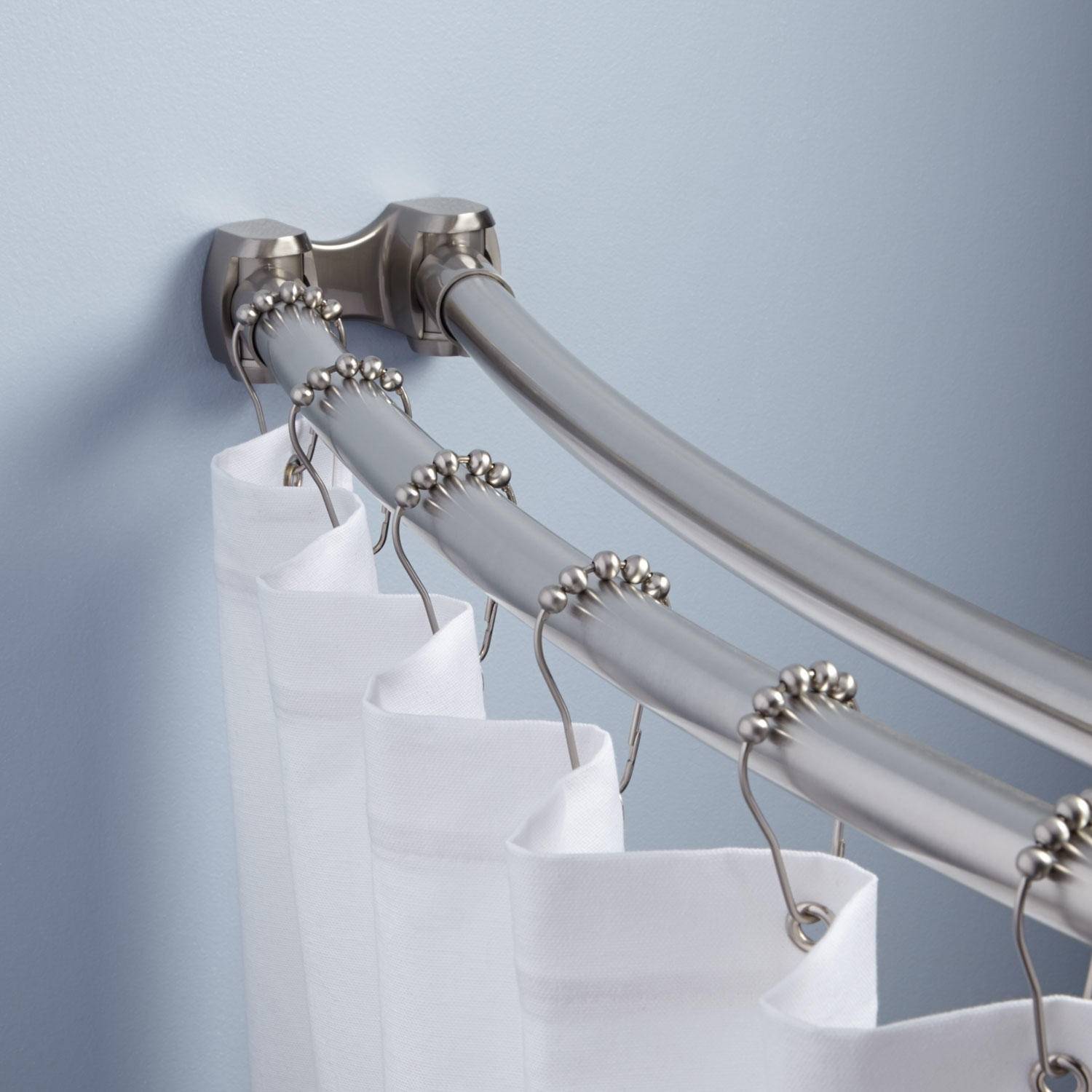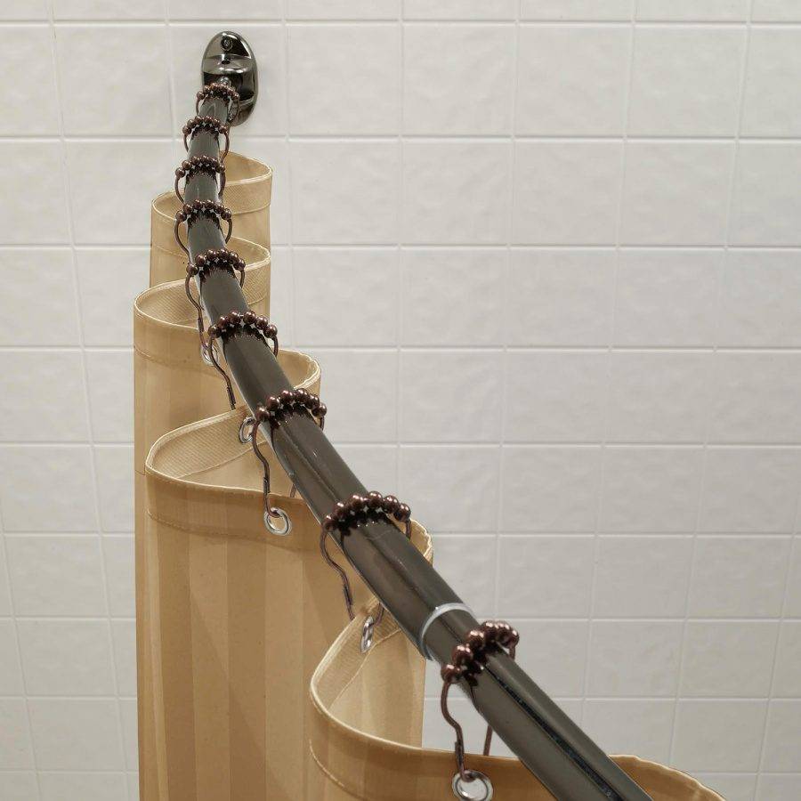- Выбирайте угловые карнизы для штор в ванную с большими кольцами или зажимами, удерживающими занавески. Они не создадут трудностей при занавешивании ванной.