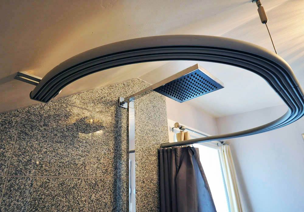 Установка душевой шторки на карнизе имеет свои плюсы: