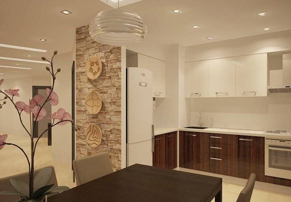 Заменить светильники можно точечным освещением и простой люстрой — идеально с точки зрения зонирования.
