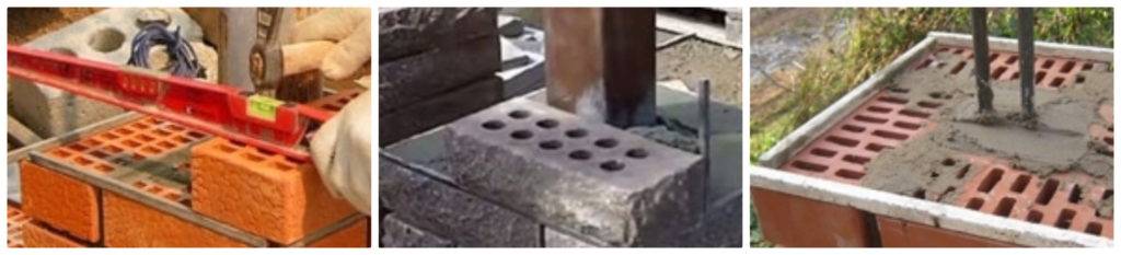 При установке стальных труб их положение следует контролировать при помощи уровня. Укладка кирпичей производится только после полного застывания бетона. Для кладки используют цемент марки М400 и песок.