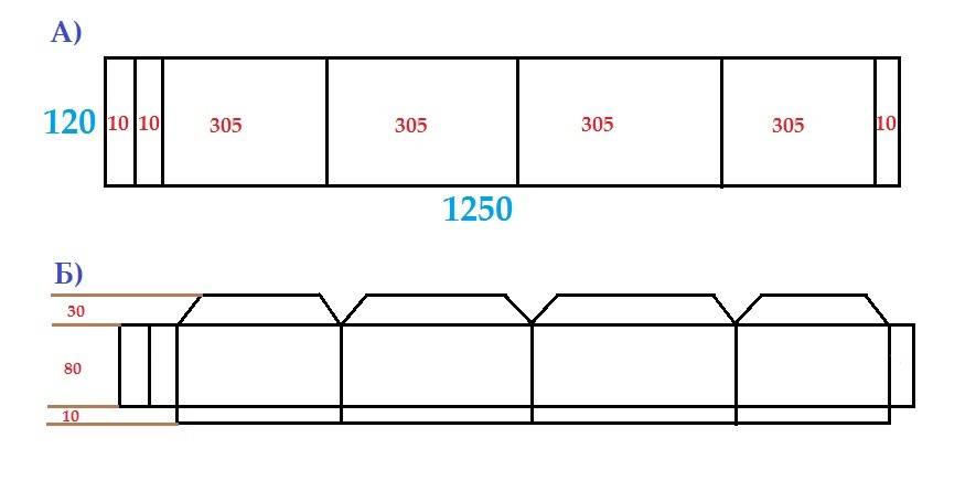 На рис. А показано общая длина 1250 мм и высота (ширина) 120 мм. Красным цветом с боков по 10 мм показано как расчертить замки. Еще в припуск 300 мм на каждую сторону добавили по 5 мм. Чтобы юбка немного была по свободней. Пускай будет лучше с небольшим зазором чем в натяг, потом увидите разницу при монтаже.