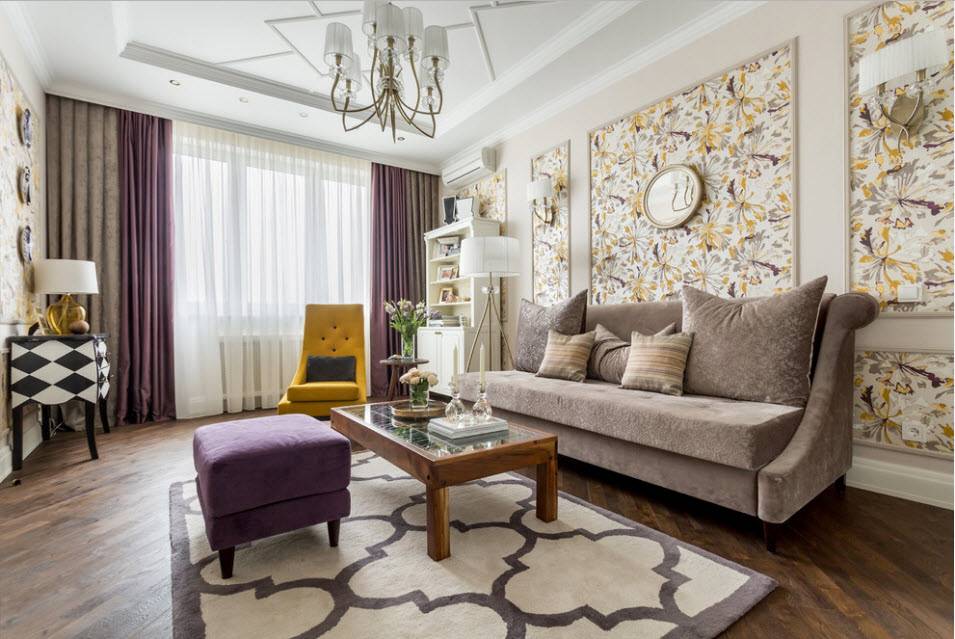 Дизайн обоев для гостиной зависит от умения комбинировать рулоны в общей гамме. Для этого используют 2 метода: