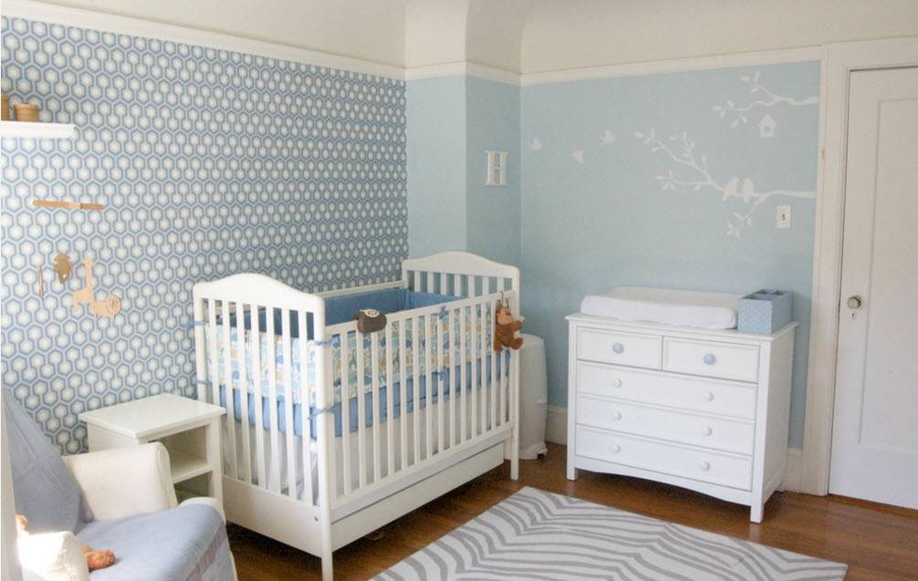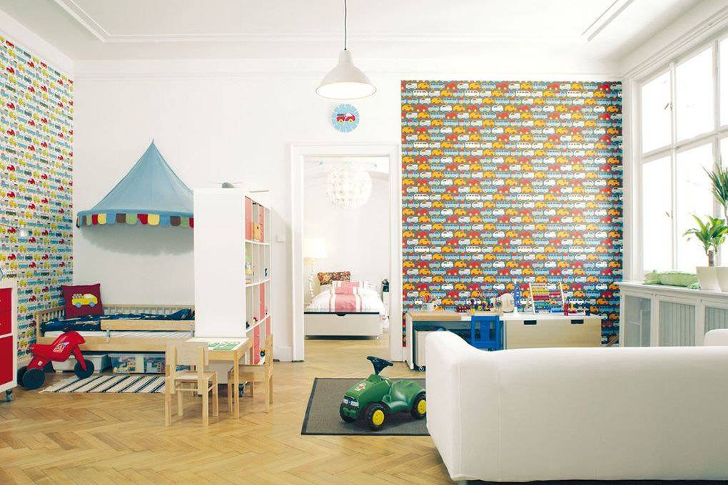 Для выделяемых зон традиционно берутся более темные, яркие обои, часто с рисунком. В детской можно оклеить обоями с веселыми картинками зону игр и участок стены над письменным столом; промежутки между ними, а также спальное место лучше оформить в спокойных тонах. Так достигается акцент на некоторых участках, подчеркивается их значение.