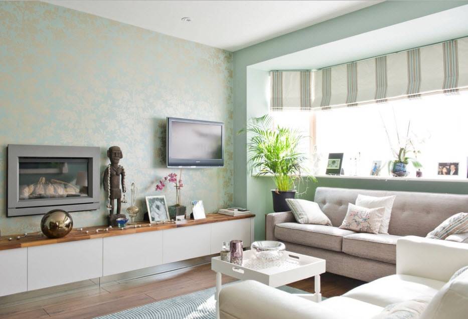 Выделения стен. Площадь, на которой делается акцент, оклеивается полотном дополняющего цвета. Такой дизайн визуально выравнивает форму гостиной, маскирует имеющиеся недостатки квартир стандартной планировки. Этот прием рекомендуют для небольшого или прямоугольного зала.