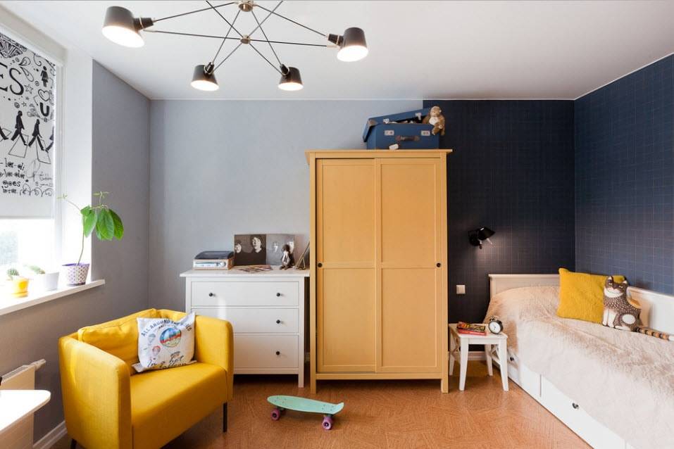 одна стена оформляется яркими обоями, остальные – фоновыми. Такой вариант часто применяется в отделке детской комнаты;