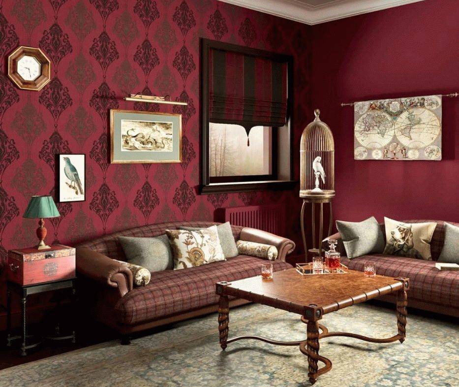 Для темной мебели гостиной или зала стены не должны быть яркими, так как на таком фоне мебель будет выделяться тяжелыми темными пятнами, лучше подбирать покрытия более спокойных расцветок. А мебель светлых оттенков может хорошо гармонировать со стенами яркого цвета с крупным рисунком. Интерьер зала обои могут превратить в любой из понравившихся стилей. Комбинированные, где верх стены оклеивается покрытиями с рисунком, хорошо сочетаются с нижней частью более темных тонов с полоской. На стыке разных по рисунку покрытий наклеивается бордюрная лента. Так можно поддерживать викторианский стиль, свойственный Англии средних веков.