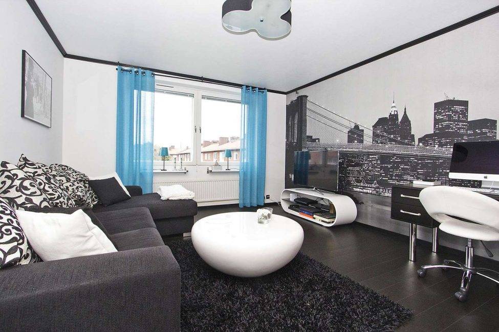 - Совет, изложенный в пункте №1, подойдет и для просторного помещения: гостиная визуально станет просторней, а холодные цвета помогут еще больше увеличить пространство. А еще – добавят своеобразной пикантности.