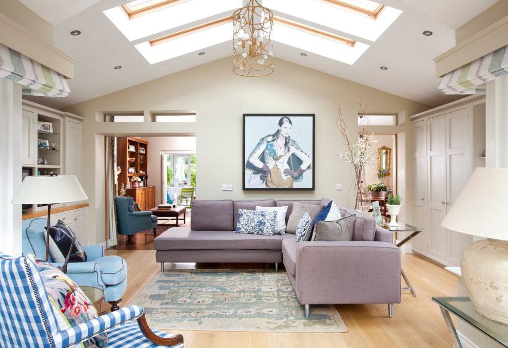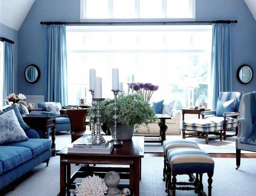 Если окна выходят на южную сторону, то гостиная может быть и холодных оттенков, так как в комнате достаточно дневного освещения.