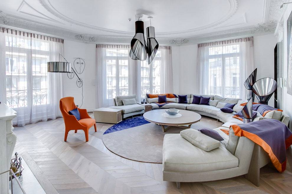 На фото закругленный диван, форма которого идеально подходит под декор потолочного покрытия