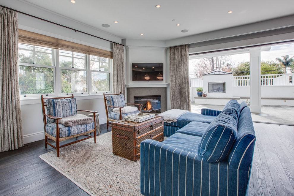 На фото мягкая мебель с белыми полосками на синем фоне – распространенное решение для воссоздания средиземноморского стиля