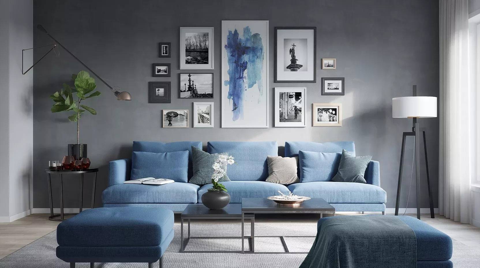 Такие тона подходят либо для залитых солнцем гостиных, либо для реализации сдержанного современного стиля. Однако и помещение в холодных цветах можно сделать уютным, добавив светлые оттенки для фона, акценты из теплой палитры и деревянную меблировку.