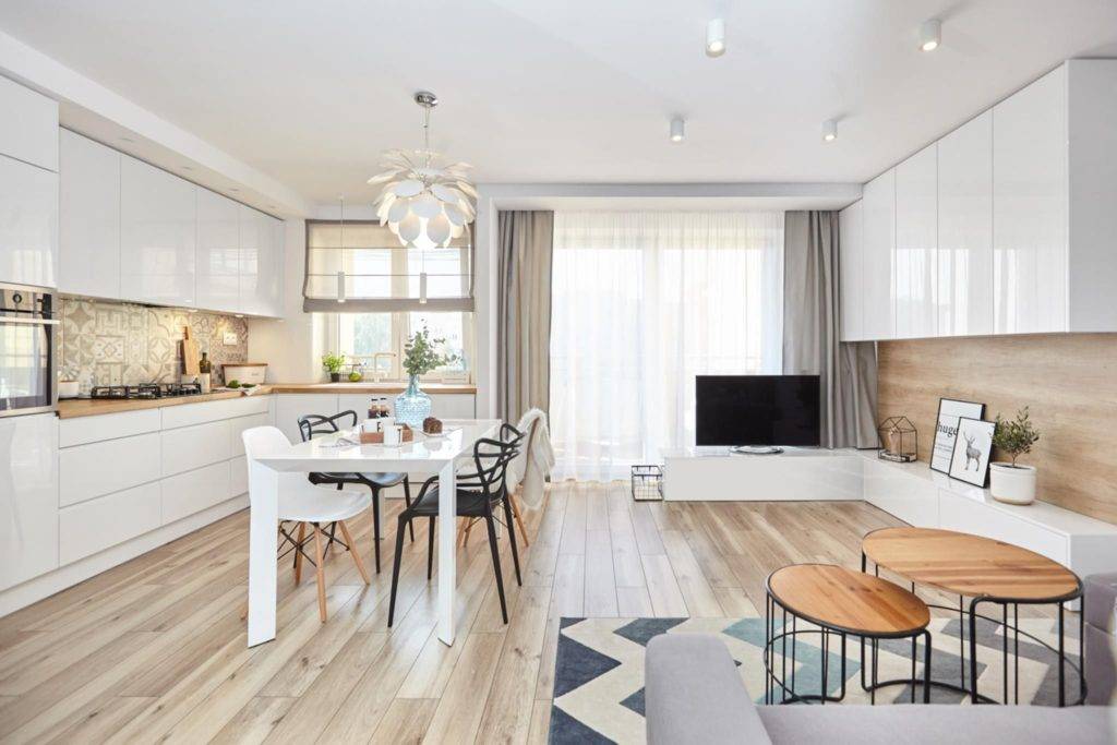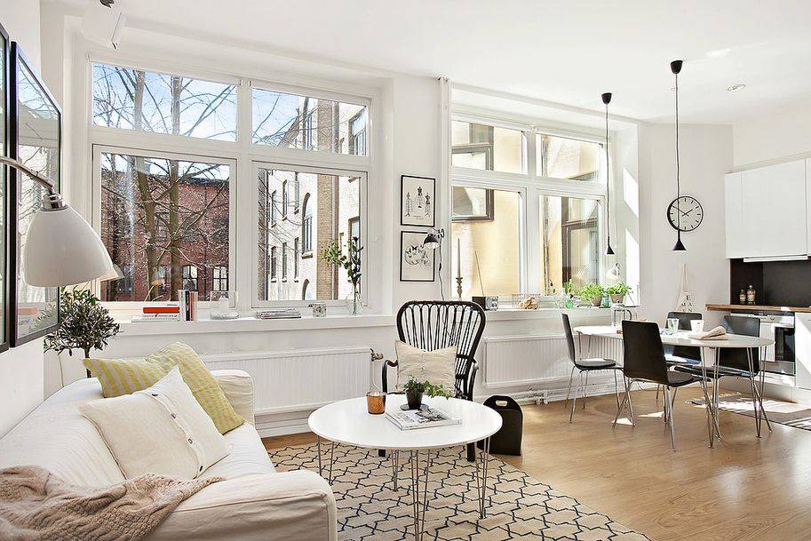 - Небольшие жилые комнаты обычно соединяются с кухонной зоной, а затем обеденный стол отделяет кухонную зону от зоны гостиной.