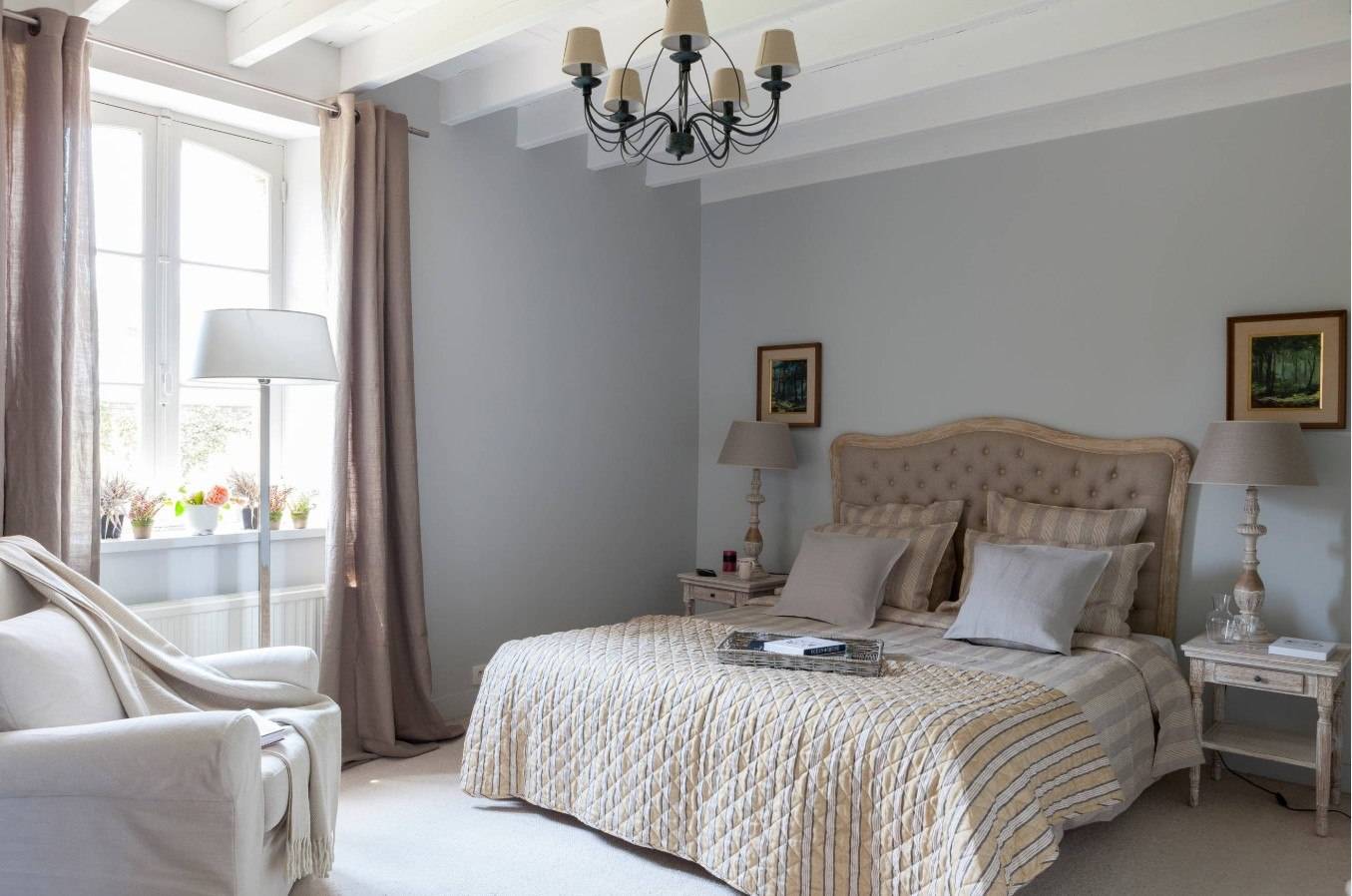 Для спальни в стиле кантри отдайте предпочтение однотонным обоям