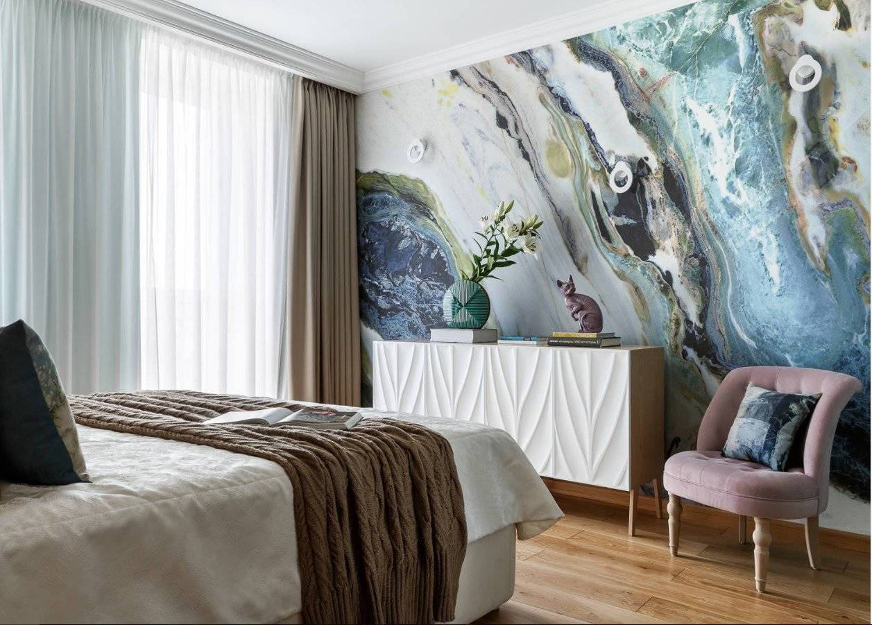 Интерьеры этого направления привлекают лаконичностью декора. Добиться эффекта поможет идеально подобранная в тон обстановки отделка стен, желательно совершенно лишенная рисунка. Компенсировать однотонность обоев в интерьере спальни поможет их легкая фактурность. Допустима неяркая абстракция. Можно добавить в дизайн акцентную стену с крупным изображением. Такой элемент стенового декора станет самостоятельной декоративной единицей обще интерьерного ансамбля.