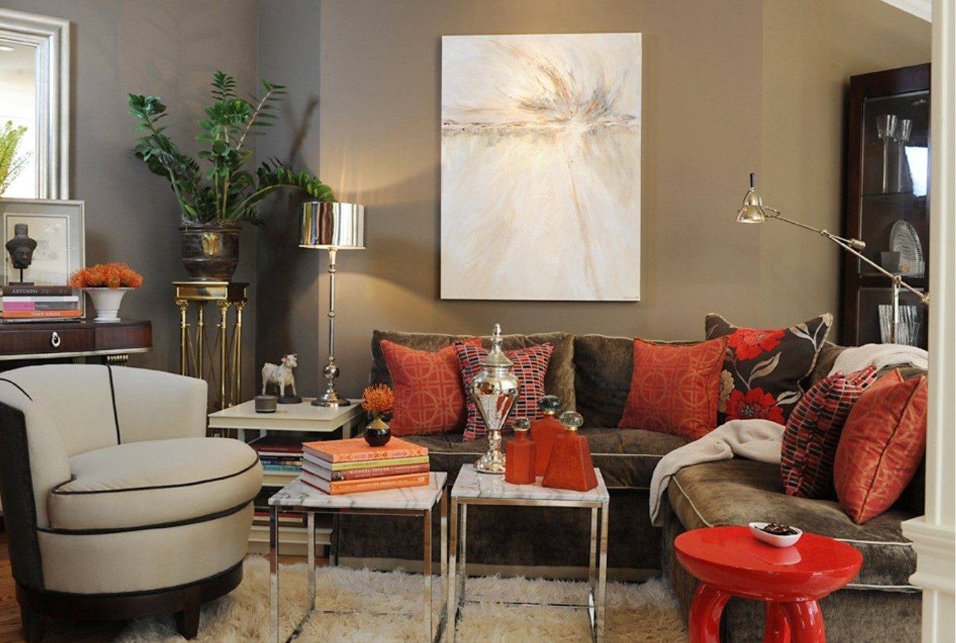 Коричневый не обязательно комбинировать только в спокойной цветовой гамме. Еще одно, более смелое предложение для такой гостиной — это яркие и насыщенные цвета. Коричневый в оформлении гостиной будет работать с темно-фиолетовым, пастельно-розовым, нежно-желтым и красным. Каждый цвет даст различный эффект, так как все зависит от соответствующей цветовой комбинации.