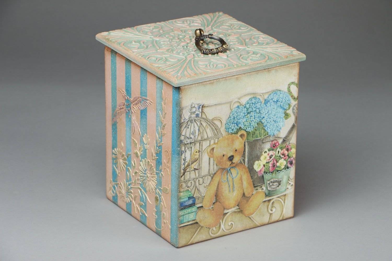 Коробочка с крышкой, украшенная декупажем, выглядит весьма празднично. Она обклеивается декупажными салфетками полностью, только сверху или же из них вырезают отдельные детали – картинки, буквы, надписи, фигуры.