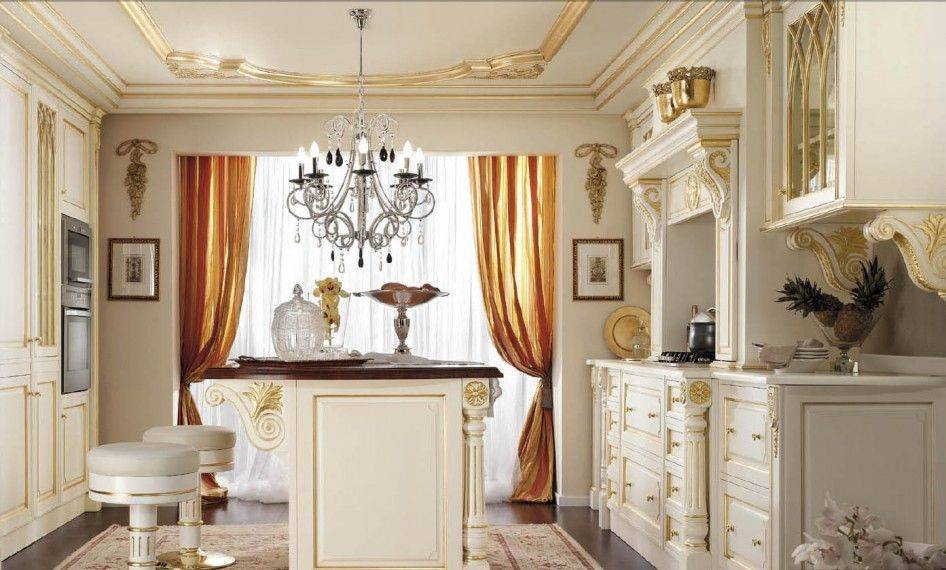 Для оформления в классической стилистике используют многослойное тканевое, гардинное полотно до пола. Уместны подхваты, ламбрекены, скрещенные холсты. В качестве отделки применяют кисею, банты, бахрому, кисточки.