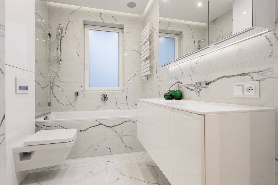 - Белая мраморная ванная комната — отличный вариант для современного оформления.
