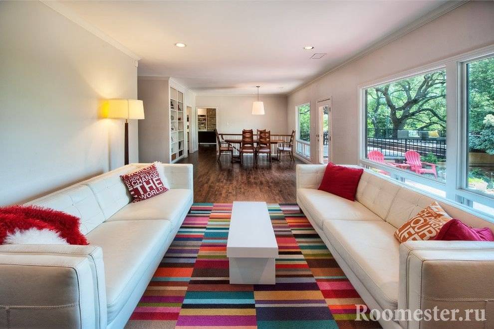 Если ваша гостиная объединена с другими помещениями, например, кухней или столовой, можно обозначить зоны с помощью ковра. Уголок для отдыха уместно выделить половиками с орнаментом или изделиями необычной формы. Для обеденной зоны лучше подобрать варианты в спокойной цветовой гамме.