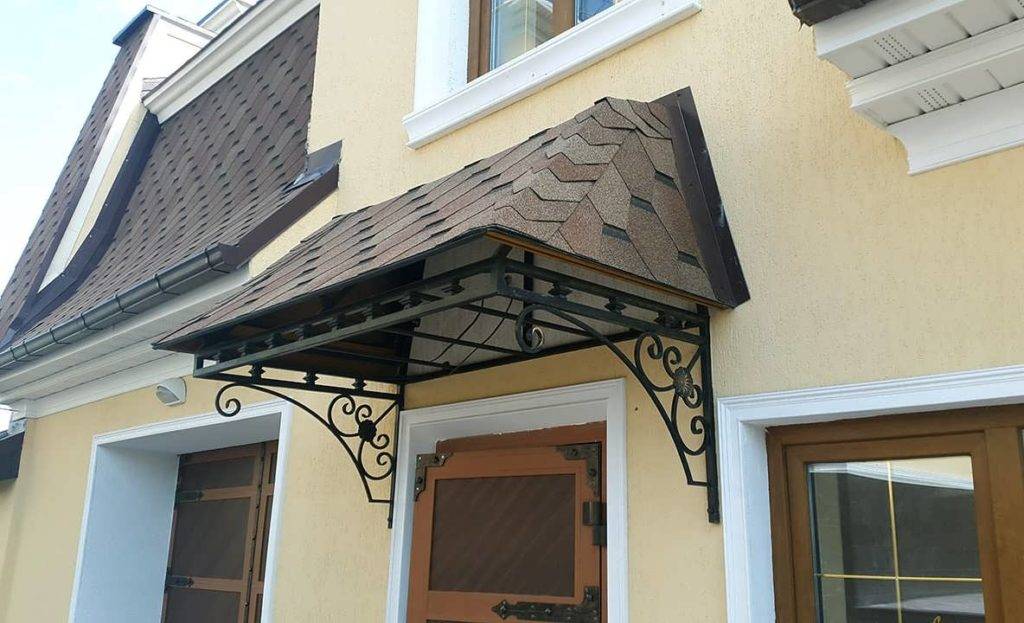 А если есть желание получить кованый козырек, то тут редко кто сможет справиться самостоятельно. Придется делать на заказ. Хотя можно купить декоративные кованые элементы в магазине, и украсить ими свой каркас.