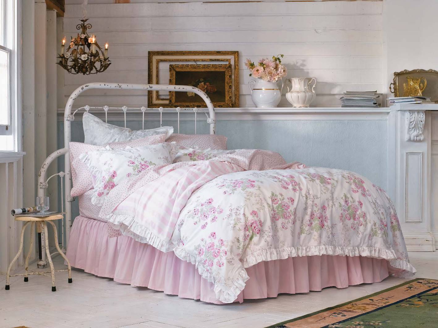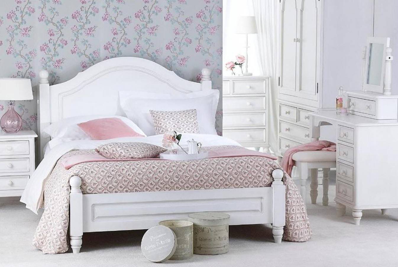 Особенностью спальни в стиле шебби-шик является контролируемое состаривание. Его проще осуществить на белой поверхности, для чего подходит каркас или спинки спального места.
