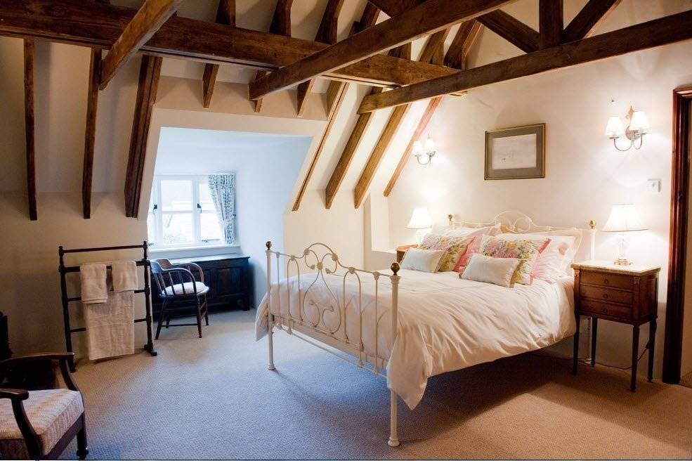 На фото интерьер спальни на мансарде с двуспальной кроватью коричневого оттенка.