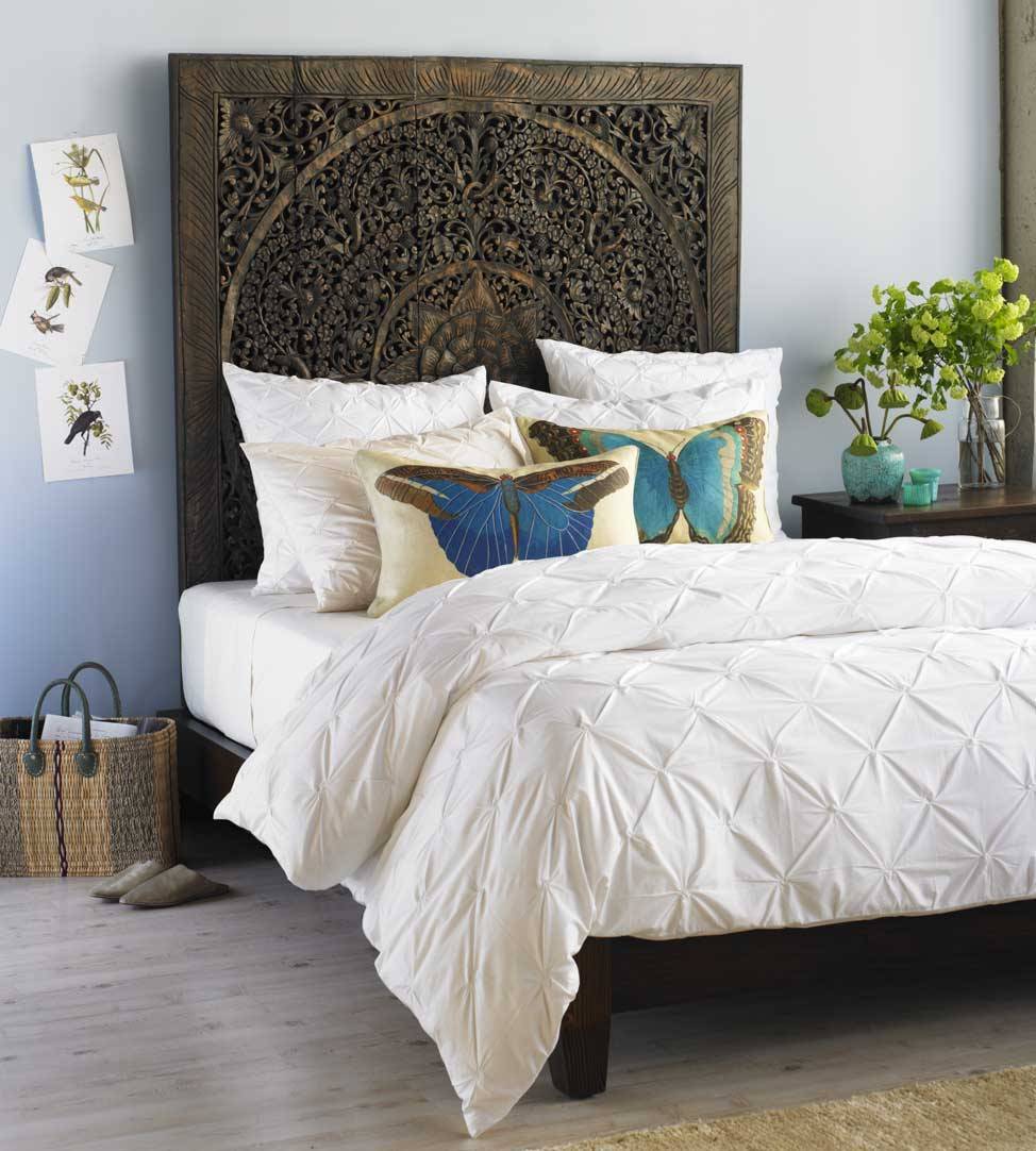 Старинная дверь с резьбой будет интересным изголовьем. Перед установкой необходимо обработать древесину антисептиком и окрасить в желаемый цвет.