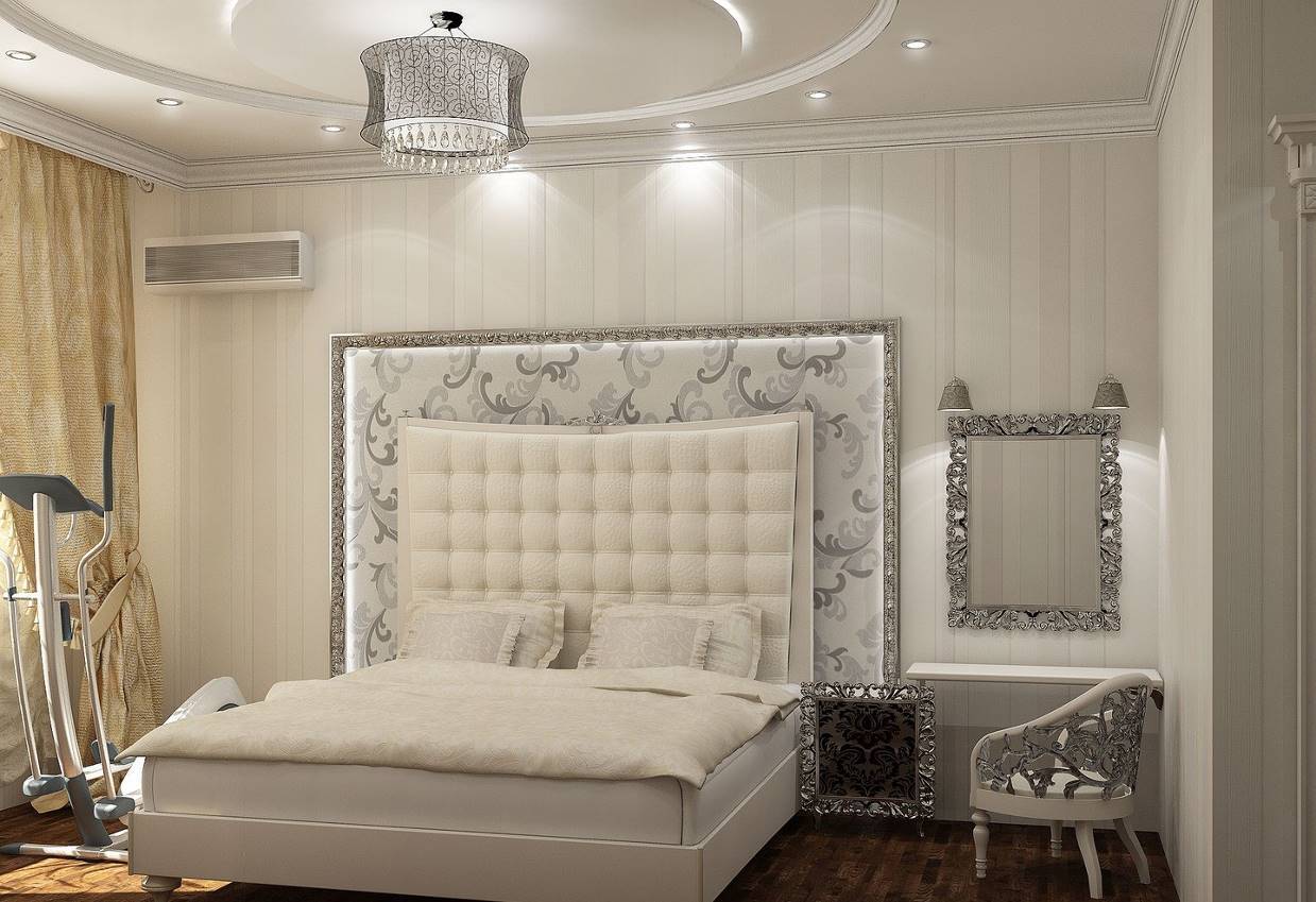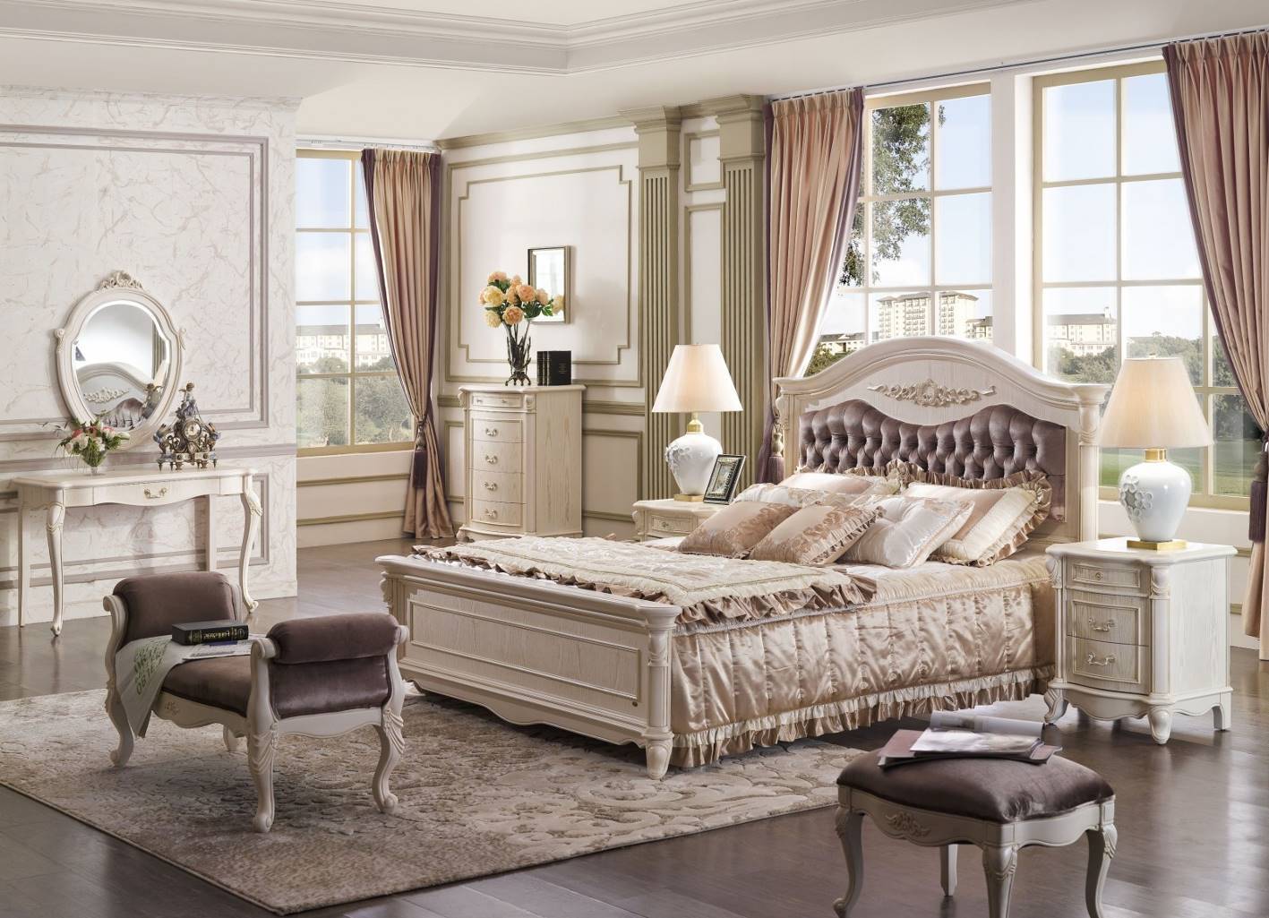 В классицизме используется кремовый оттенок, который украшается позолотой или патиной. На спинках кровати предусматривается резьба, придающая солидности. Изголовье выполняется мягким или имеет тканевую вставку, как показано на фото спальни выше.