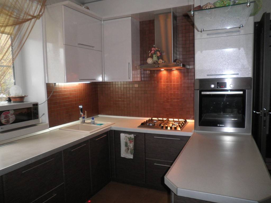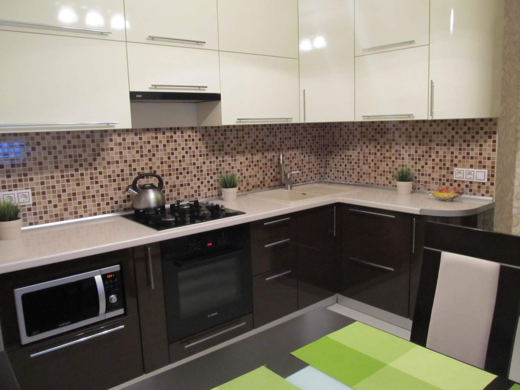 Такой дизайн будет востребован владельцами малогабаритных квартир. Его особенностью является рабочая зона, выполненная в форме треугольника, где мебель, холодильник, мойка и плита располагаются вдоль двух смежных стен и чередуются друг с другом. Таким образом, удается задействовать угол комнаты, где могут быть созданы дополнительные места для хранения посуды и т. д.